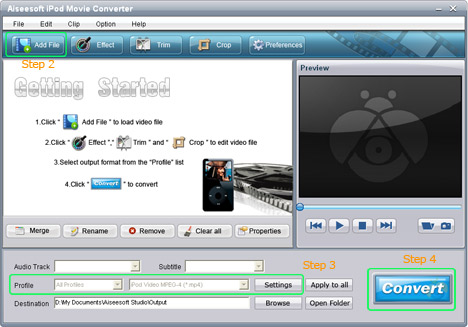 Choose the file, click "Profile" to choose the formats you need for your iPod, and then click "Browse" button to choose destination folder for saving output files. Click "Open folder" button to open destination folder to look for the converted file. Click "Settings" button to reset output video/audio parameters.